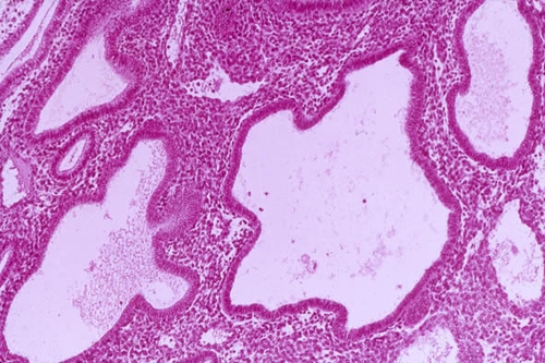 Рис. 5-2. Железисто-кистозная гиперплазия эндометрия. Количество желёз увеличено, они разной величины и формы. Окраска гематоксилином и эозином (x90). ◊ Гипертрофические разрастания.Образуются в области длительно текущих воспалительных процессов, или это увеличение объёма ткани в области нарушенного лимфообращения (слоновость нижней конечности). Они также не могут быть отнесены ни к компенсаторным, ни к приспособительным реакциям, так как не компенсируют нарушенную функцию органа, в котором развиваются. ◊ Ложная гипертрофия. Разрастание жировой клетчатки и соединительной ткани на месте атрофирующейся функциональной ткани или органа.