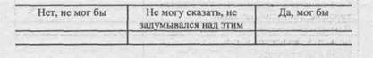 ТЕСТ "ПОДДАЕТЕСЬ ЛИ ВЫ ЧУЖОМУ МНЕНИЮ?" (КОНФОРМНОСТЬ ПОВЕДЕНИЯ) Известно ли Вам сладкое чувство свободы собственных поступков? Вы считаете себя независимым человеком, которому поток общественного мнения не страшен? А может, все-таки были моменты, когда приходилось поступать вопреки голосу интуиции и разума? Не ждите роковой минуты судьбы, подготовьте себя заранее. В этом вам поможет тест, который определит, насколько вы способны противостоять потоку, поддаться чужому мнению. Вопросы 1. Вносите ли вы в свою одежду основательные изменения, а) в таком случае вы вынуждены это делать; б) нет, так как вы одеваетесь не по рекомендации модных журналов, а в соответствии со своей индивидуальностью; в) очень мало: вы заимствуете, что вам нравится. 2. Хороший ли вы спорщик? а) да, чаще всего ваше мнение одерживает верх над мнением другого; б) едва ли, обычно вы обнаруживаете, что в большей или в) нет, потому что как бы ни были вы уверены в своей правоте, вы не можете подыскать соответствующих 3. Доверяете ли вы мнению других о человеке, который вам не знаком? а) зависит от того, кто высказывает это мнение; б) почему бы и нет? в) нет, потому что вы доверяете лишь тому, в чем сами 4. Случается ли так, что никому в компании не нравится телепередача, а вам нравится? а) разумеется, наши мнения не всегда сходятся; б) едва ли, обычно мы единодушны в оценках таких вещей; в) даже если и случается, чаще всего вас убеждают, что 5. Если вас упрекают за что-то, то что вы сделаете: измените свое поведение или нарочно будете продолжать его? а) не измените; б) все зависит от того, в какой форме об этом сказано; в) если упрек справедлив, измените, естественно. 6. Можете ли вы ровно писать на нелинованной бумаге? а) вы не можете писать даже и на линованной; б) нет, строчки у вас ползут вкривь и вкось; в) можете. 7. Поддерживаете ли вы дружеские отношения с непопулярным в вашем коллективе (в школе, в студенческой группе, на работе) человеком? а) нет, почему же тот, кого все не любят, должен быть приятен именно вам? б) если он вам симпатичен, то да; в) да, и даже потому, что чувствуете, как он нуждается в вашей защите. 8. Больше или меньше нравятся вам дома в старинном стиле, чем нравились пять лет назад? а) больше; б) меньше; в) в той же степени. 9. Как, по-вашему, всякая ли сплетня безосновательна? а) да; б) иногда в сплетне есть доля истины; в) нет дыма без огня. 10. Нравится ли вам одежда, которая раньше не нравилась, если многие ее хвалят? а) да, потому что вдруг другие видят лучше вас; б) нет, потому что в любом случае вы себя неуютно в ней в) зависит от того, насколько вы верите тем, кто хвалит. 11. Считаете ли вы правильным то, что пишут критики в рецензиях на фильмы? а) да, те, кто пишет, во всяком случае, профессионалы; б) нет, и совершенно противоположное тому, что пишут, тоже неправильно; в) нельзя обобщать: иногда да, иногда нет. - 12. Если однажды на работе случается неприятность, склонны ли вы вечером после работы пускаться в споры в компании? а) только в таком случае действительно спорите; б) нет, в такой период вы стараетесь избегать подобных испытаний; в) эти две вещи не зависят одна от другой. 13. Боретесь ли вы за свои убеждения, если это не нравится кому-то из ваших коллег по работе (учебе)? а) если стоит это делать, то конечно; б) зависит от того, против кого следует бороться; в) нет, вы уже много раз обожглись на этом. 14. Если вы 