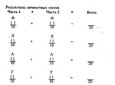Оценку своих результатов начните с части 1 и подсчитайте, сколько раз вы отметили ответы "да" или "нет", рядом с кото- I рыми стоит буква Ф. Это даст вам значение для показателя Ф. Подставьте его в приводимую ниже формулу. То же проделайте для букв Л, А и Г. Повторите эту операцию в части 2. Затем сложите значения, полученные для каждой буквы в обеих частях теста, и вы узнаете, какое количество баллов вы набрали из 20 максимально возможных, Чтобы проверить, правильно ли вы все подсчитали, по очереди возьмите числа, полученные для каждой буквы, и сложите их с числом раз, когда вы выбирали ответ, рядом с которым стоит парная буква. Вы можете видеть, что в паре с Ф стоит С, в паре с Л - К, в паре с А - П и в паре с Г - И. В каждой части теста для каждой пары букв в сумме должно получиться 10. Максимальное количество баллов и в части 1, и в части 2 равно 10. Каждая из полученных вами оценок характеризует одну из сторон вашей личности. Эти оценки можно рассматривать в совокупности, это так и следует делать, потому что ваша личность едина во всех своих проявлениях. Однако для понимания ваших индивидуальных особенностей сначала будет полезно рассмотреть каждый из четырех показателей отдельно.