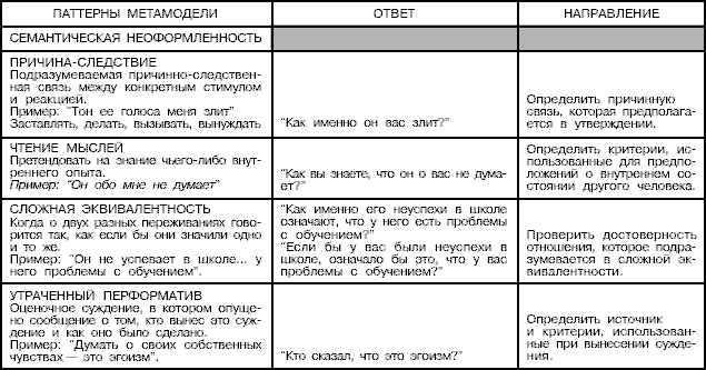 4. Утраченный перформатив. Оценочные слова — “ правильно, неправильно, хорошо, плохо, справедливо ” и т. д. — имеют тенденцию к диссоциации от действий, причин и референтного опыта, впервые установивших их ценность. Другими словами, процесс и перспектива, через которые суждение было сделано вначале, оказалось утерянным на уровне поверхностной структуры. Такие слова часто могут носить более жесткий или претенциозный характер, чем быть полезными. Сказать, что “у Фрейда была правильная карта мира” или что “у Фрейда была неправильная карта мира” в равной степени догматично и бесполезно. В обоих этих утверждениях говорящий уравнивает или путает свое собственное представление о мире с самим миром. В сложной системе существует множество разных перспектив, каждая из которых имеет свою собственную ценность и важность. По словам антрополога Грегори Бейтсона, “мудрость приходит тогда, когда мы садимся вместе и правдиво обсуждаем наши различия… без намерения их изменить”. Таким образом, в ответ на утраченный перформатив следовало бы задать вопрос: “Правильно или неправильно, в соответствии с чьим мнением?” или “Плохо в соответствии с какими критериями?” или “Хорошо в сравнении с чем?” Положительная задача “утраченных перформативов” заключается в том, чтобы придать значение и смысл наблюдаемым действиям и событиям. Они часто являются конечным результатом интерпретаций. Не так важно избавиться от оценок, как определить и знать путь, по которому человек пришел к конечному выводу. Часто мы принимаем вывод без проверки и без исследования тех шагов, которые к нему привели. Фрейд, по-видимому, твердо намеревался “восстановить” перформативы, лежащие в основе его оценок. И может быть, как раз в этом и заключается ключ к его успеху и славе. Он проследил собственные мыслительные процессы путем развития высокой степени “метазнания” собственных мыслительных паттернов. Замечание Фрейда, что ему нужно было проанализировать путь своей собственной глубинной реакции на статую Моисея работы Микеланджело, потому что “некоторая рационалистическая или, возможно, аналитическая часть моего ума восстает против того, чтобы подвергнуться воздействию чего-либо, не зная почему так сильно это воздействие на меня и что именно на меня воздействует”, указывает на значительное осознание утраченных перформативов. Хотя у него были отдельные “белые пятна” относительно других паттернов метамодели, но все же данная способность явилась самой сильной стороной Фрейда, той сильной стороной, которая сделала его тем, кем он был. В таблице, приведенной ниже, основные паттерны метамодели и вопросы, которые следует задавать для того, чтобы исследовать глубинные структуры, лежащие в их основе. Если посмотреть на различные паттерны метамодели, станет ясно, что к одному слову или группе слов можно применить одновременно более одной из этих категорий. Некоторые слова представляют несколько областей неясности. Точно так же и некоторые утверждения часто содержат более одного паттерна метамодели.