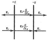 Рассмотрим две параллельных бесконечных плоскости, заряженных с постояннойповерхностной плотностью и.Направление линии напряженности см. на рис. В качестве замкнутой поверхности опять выберем цилиндр. Слева и справа от плоскостей линии напряженности направлены на встречу друг к другу, поэтому здесь напряженность поля равна нулю.