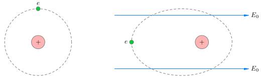 Слева изображена симметричная электронная орбита в атоме неполярного диэлектрика. При наложении внешнего поля E0 эта орбита деформируется (справа): электрон смещается в сторону положительных зарядов, создающих внешнее поле. Мы видим, что во внешнем поле электрон будет проводить больше времени слева от ядра, нежели чем справа. Из-за этого центры положительных и отрицательных зарядов в атоме неполярного диэлектрика разойдутся в разные стороны. То есть получаем какбэ диполь, но не диполь.