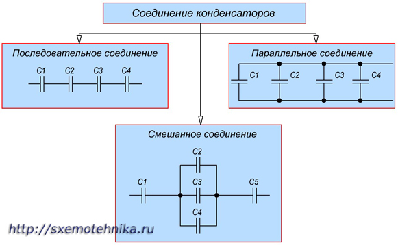 I — сила тока. Конденсаторы. Конденса́тор (от лат. condensare — «уплотнять», «сгущать») — двухполюсник с определённым значением ёмкости и малой омической проводимостью; устройство для накопления заряда и энергии электрического поля. Конденсатор является пассивным электронным компонентом. В простейшем варианте конструкции состоит из двух электродов в форме пластин (называемых обкладками), разделённых диэлектриком, толщина которого мала по сравнению с размерами обкладок (см. рис.). Практически применяемые конденсаторы имеют много слоёв диэлектрика и многослойные электроды, или ленты чередующихся диэлектрика и электродов, свёрнутые в цилиндр или параллелепипед со скруглёнными четырьмя рёбрами (из-за намотки). Соединение конденсаторов В электрических цепях применяются различные способы соединения конденсаторов. Соединение конденсаторов может производиться: последовательно, параллельно и последовательно-параллельно (последнее иногда называют смешанное соединение конденсаторов). Существующие виды соединения конденсаторов показаны на рисунке 1.