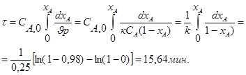 Находим производительность по продукту R: ПR = G0 СА,0 хА /vA =3,6∙0,5∙0,7/2=0,63кмоль/ч. Рассчитываем время пребывания в реакторе идеального вытеснения(см. таб.2):