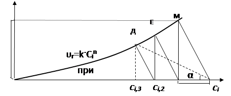 которое на графике в координатах Для расчета К-РИС-Н графическим методом необходимо: 1. Вначале построить график по уравнению (19) зависимости ur от Сi. 2. Затем из точки, лежащей на оси абсцисс, для которой 3. Опустив перпендикуляр из точки пересечения М на ось абсцисс, получают значение концентрации реагента на выходе из первого реактора. Эта же концентрация является исходной для второго реактора. 4.