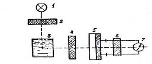 1 – источник УФ – излучения; 2, 4 – светофильтры; 3 – кювета с раствором; 5 – фотоэлемент; 6 – электронный усилитель; 7 – микроамперметр.
