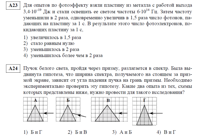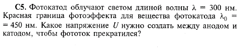 В67 На дифракционную решетку, имеющую период 2·10–5 м, падает нормально параллельный пучок белого света. Спектр наблюдается на экране на расстоянии 2 м от решетки. Каково расстояние между красным и фиолетовым участками спектра первого порядка (первой цветной полоски на экране), если длины волн красного и фиолетового света соответственно равны 8·10–7 м и 4·10–7 м? Считать sinφ = tgφ. Ответ выразите в см С23 Фотокатод, покрытый кальцием (работа выхода 4,42×10–19 Дж), освещается светом с длиной волны 300 нм. Вылетевшие из катода электроны попадают в однородное магнитное поле с индукцией 8,3×10–4 Тл перпендикулярно линиям индукции этого поля. Каков максимальный радиус окружности, по которой движутся электроны? А34 Фотоны с энергией 2,1 эВ вызывают фотоэффект с поверхности цезия, для которого работа выхода равна 1,9 эВ. Чтобы максимальная кинетическая энергия фотоэлектронов увеличилась в 2 раза, нужно увеличить энергию фотона на
