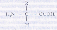Из формулы видно, что к центральному атому углерода присоединены четыре разные группы. Три из них — атом водорода Н, щелочная аминогруппа NH2 и кислая карбоксильная группа СООН - для всех аминокислот одинаковы. По составу и структуре четвертой группы, обозначенной R аминокислоты отличаются друг от друга. В самых простых структурах, например, в молекуле аминокислоты глицина — такая группа представляет собой атом водорода, в молекуле аланина — СН3 и т. д. Таким образом, в состав аминокислот входят все четыре органогена: С, О, Н, N, а в некоторые радикалы может входить сера. Химическая связь — СО — NH —, соединяющая аминогруппу одной аминокислоты с карбоксильной группой другой в молекулах белков, называется пептидной связью (ковалентная связь).