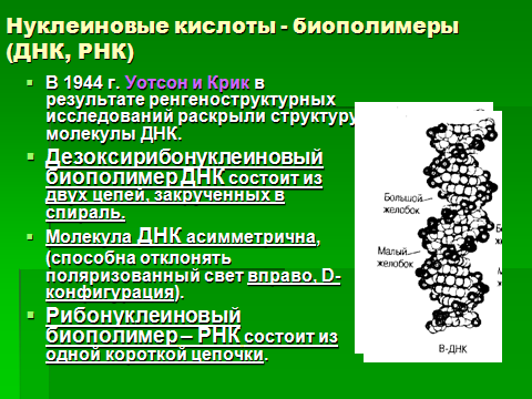 Откуда аминокислоты узнают, в каком порядке и количестве им «строиться», чтобы образовать нужный белок? Для этого в клетке существуют нуклеиновые кислоты — ДНК и РНК. Свое название нуклеиновые кислоты (от лат. nucleus — ядро) получили из-за того, что впервые были выделены из ядер лейкоцитов еще во второй половине XIX в. швейцарским биохимиком Ф. Мишером. Позже было обнаружено, что нуклеиновые кислоты могут находиться не только в ядре, но и в цитоплазме (прокариотических клеток и вирусов) и в органеллах клетки (митохондриях и хлоропластах). Нуклеиновые кислотыобразуют самые крупные молекулы, синтезируемые живыми организмами. Они существуют в виде полимерных макромолекул, участвующих в хранении и передаче наследственной информации. Молекулы ДНК вместе с белками-гистонами образуют вещество хромосом. Вторичная структура ДНК была установлена методами рентгеноструктурного анализа в 1953г американским биохимиком Дж. Уотсоном и английским биофизиком и генетиком Ф. Криком удостоенными вместе с английским биофизиком М. Уилкинсоном получившим рентгенограмму ДНК, Нобелевской премии 1962 г.