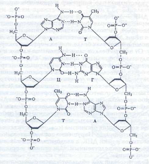 Рис 4. Строение нуклеотида Азотистые основанияя входящие в состав нуклеиновых кислот это: тимин (Т), аденин (А), (урацил (У), гуанин (Г), цитонин (Ц), такие же названия имеют и нуклеотиды. Порядок расположения нуклеотидов в молекулах ДНК и РНК определяет порядок расположения аминокислот и их воспроизведение в первичных структурах белков. Таким образом, через молекулы ДНК и РНК передается информация о наследственных свойствах биологических структур и реализуется механизм наследственности. В рибонуклеиновой кислоте (РНК) сахаром является углевод рибоза (С5Н10О5)) а в дезоксирибонуклеиновой кислоте (ДНК) — углевод дезоксирибоза (С5Н10О4), который отличается от рибозы только тем, что около одного из атомов углерода ОН-группа заменена на атом водорода. «Алфавит» каждой из нуклеиновых кислот состоит всего из четырех «букв», Три из указанных азотистых оснований — Г, А и Ц — входят в состав и РНК, и ДНК. Четвертое азотистое основание в этих кислотах разное — Т входит только в ДНК, а У — только в РНК. РНК содержит 4 — 6 тыс. нуклеотидов, ДНК — 10 — 25 тыс. Если бы можно было вытянуть ДНК одной человеческой клетки в непрерывную нить, то ее длина составила бы 91 см., Молекула ДНК похожа на веревочную лестницу: «кусочки», которых она состоит и которые называются нуклеотиды, соединяются между собой вдоль и поперек. веревочной лестницей, где роль «веревок» играют сахаро-фосфатные остовы, «перекладин» — основания, расположенные перпендикулярно оси спирали. Каждая перекладина образована двумя основаниями, присоединенными к двум противоположным цепям, причем если у одного основания одно кольцо, то у другого — два. Таким образом, образуются комплиментарные пары: А-Т и Г-Ц связанные водородными связями. При этом аденин всегда распознает только тимин и связывается с ним двумя водородными связями, и наоборот. Гуанин и цитозин связаны тремя водородными связями. Такие пары оснований, как и нуклеотиды, называются комплементарными (. (рис.5, 6).