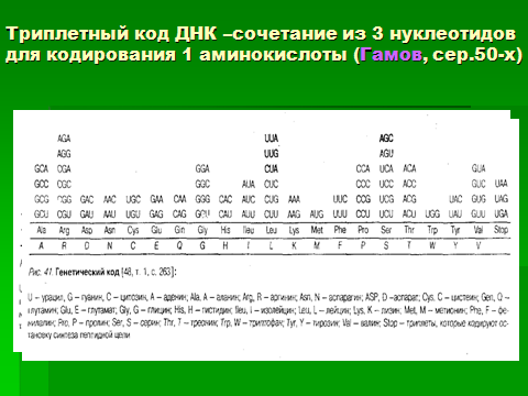 Рис. 6. Принцип комплементарности Рождение молекулярной генетики произошло, когда американцы Дж. Бидл и Э. Тэйтум установили прямую связь между состоянием генов (ДНК) и синтезом ферментов (белков). Именно тогда появилось знаменитое высказывание «Один ген — один белок». Позже было выяснено, что основной функцией генов является кодирование синтеза белка. После этого ученые сконцентрировали свое внимание на вопросе, как записана генетическая программа и как она реализуется в клетке. Для этого нужно было выяснить, как всего четыре основания могут кодировать порядок расположения в молекулах белка целых двадцать аминокислот. Основной вклад в решение этой проблемы внес знаменитый физик-теоретик Г. Гамов в середине 50-х годов XX в. По его предположению, для кодирования одной аминокислоты используется сочетание из трех нуклеотидов ДНК. Эта элементарная единица наследственности, кодирующая одну аминокислоту в белке, получила название триплета или кодона. Сразу возникает вопрос: сколько различных троек можно получить из четырех «букв»? Легко сообразить, что таких троек может быть 43 = 64. Но в образовании белков может участвовать всего 20 аминокислотных остатков, значит, некоторые из них можно кодировать разными тройками, что и наблюдается в природе. Например, лейцин, серии, аргинин кодируются шестью тройками, пролин, валин и глицин — четырьмя и т. д. Это свойство триплетного генетического кода называется избыточностью генетического кода. Генетический код всего живого, будь то растение, животное или бактерия, одинаков(универсальность кодирования). В 1961 г. гипотеза Гамова была подтверждена исследованиями Ф. Крика. Так был расшифрован молекулярный механизм считывания генетической информации с молекулы ДНК при синтезе белков (рис. 7). .