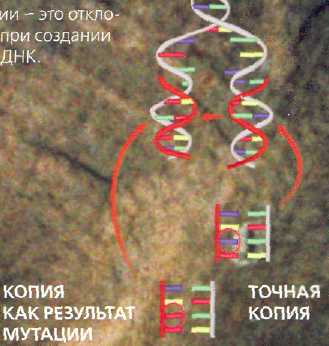 Рис. 8. Мутации, возникающие при удвоении ДНК Для молекул ДНК характерно важное свойство удвоения — образования двух одинаковых двойных спиралей, каждая из которых идентична исходной молекуле. Такой процесс удвоения молекулы ДНК называется репликацией. Репликация включает разрыв старых и формирование новых водородных связей, объединяющих цепи нуклеотидов. В начале репликации две старые цепи начинают раскручиваться и отделяться друг от друга (рис. 9).