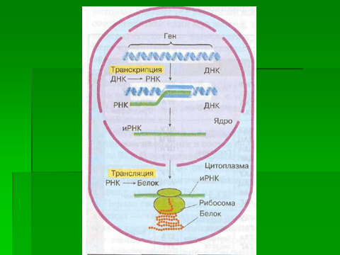Рис.10. Транскрипция и трансляция в клетке Транскрипция — это перенос информации о структуре белка, выраженной в последовательности триплетов нуклеотидов с ДНК матрицы (участка ее цепи - гене) на информационную РНК при ее синтезе с участием фермента РНК-полимеразы. Трансляция - перевод информации, выраженной в последовательности нуклеотидов в мРНК в последовательность аминокислот в белковой молекуле в процессе ее синтеза. Синтез белка происходит в цитоплазме клетки на основе генетического кода и-РНК по принципу комплементарности с участием органелл — рибосом, куда транспортные РНК (более двух десятков видов) доставляют нужные аминокислоты. Сборка одной молекулы белка, состоящей из 200 — 300 аминокислот, происходит при участии ферментов за 1 —2 мин. и требует сравнительно больших затрат энергии (рис.10,11).