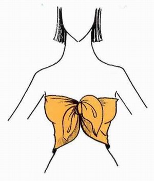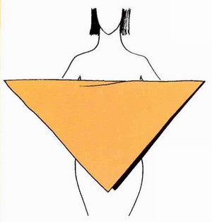 1. Сложите квадратный платок размером 140 х 140 см треугольником. Оберните платок вокруг груди, сгиб вверху.