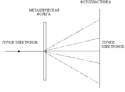 Пучок электронов, ускоренных разностью потенциалов порядка нескольких десятков киловольт, проходит через тонкую металлическую фольгу и попадает на фотопластинку. При столкновении с фотопластинкой электрон оказывает на нее такое же действие, как и фотон. Полученное таким образом изображение на фотопластинке называется электронограммой. Сравнение электронограммы с рентгенограммой (изображения, возникающего при дифракции электромагнитного излучения) указывает на дифракционный характер рассеяния электронов веществе, которое интерпретируется как распределение вероятности попадания электрона в различные точки экрана. Прошедший через кристалл электрон в результате взаимодействия с кристаллической решёткой образца отклоняется от первоначального направления движения и попадает в некоторую точку фотопластинки, установленной за кристаллом. При длительной экспозиции постепенно возникает упорядоченная картина дифракционных максимумов и минимумов в распределении электронов, прошедших через кристалл. Точно предсказать, в какое место фотопластинки попадёт данный электрон, нельзя, но можно указать вероятность его попадания после рассеяния в ту или иную точку пластинки. Общим условием дифракции волн любой природы является соизмеримость длины падающей волны В рамках волновой теории дифракции электронов положение главных максимумов определяется формулой дифракционной решётки для электромагнитного излучения: