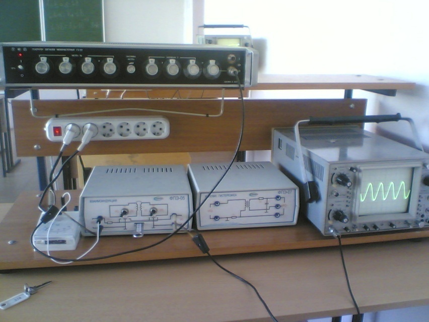 Рис. 8.4а. Внешний вид монтажной схемы Выполнение измерений 1. Соберите электрическую цепь по монтажной схеме, приведенной на рис. 8.4. Установите необходимые режимы измерения мультиметра 2 и осциллографа 5 (см. рис. 8.3). 2. Включите кнопками «Сеть» питание блока генераторов напряжения и блоков мультиметра и осциллографа. 3. В таблицу запишите параметры N 1, N 2, l 1, S 1. Таблица 8.1