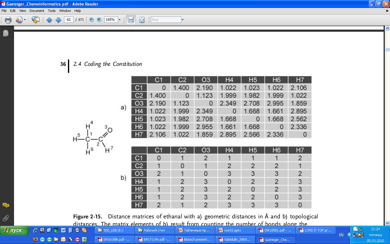 Элементы данной вида матрицы содержат значения, которые определяют самое короткое расстояние между связанными атомами. Расстояния можно изображать или как геометрические расстояния (в ангстремах) или как топологические расстояния (в ряду связей) (рис. 2.15).