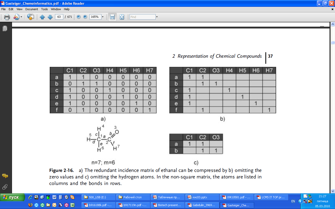 Рис. 2.16. а) избыточная матрица понижения этаналя может быть уменьшена путем б) удаления значений нуля с) удаления информации об атомах водорода. В неквадратной матрице атомы указаны в колонках, cвязи – в рядах.