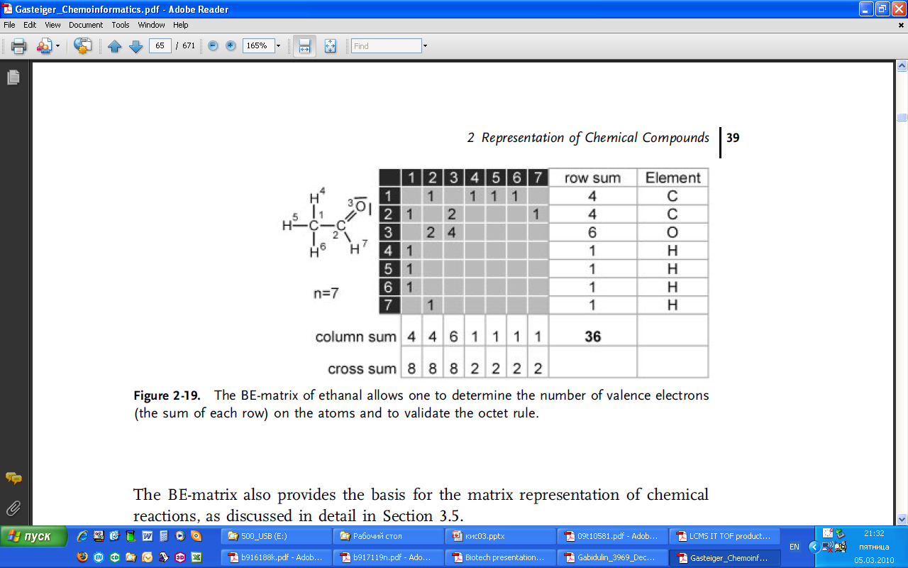Матрица связь – электрон (BE матрица) Матрица связь – электрон (BE матрица) была предложена в модели Dugundji-Ugi. Ее можно рассматривать как расширение матрицы связей. Этот тип матрицы дает дополнительно число свободных валентных электронов на соответствующем атоме в диагональных элементах (например, О3 = 4 на рис. 2.18).
