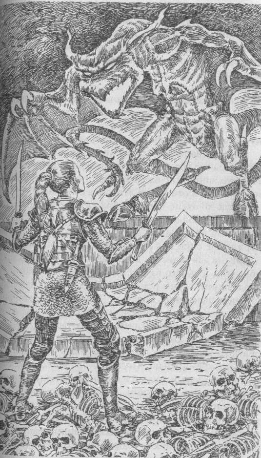 Тави не отвечала. Бестия не двигалась, пристально глядя на нее своими алыми буркалами. Разумеется, это были не звериные глаза. В них читался разум – не злой, не кровожадный, не извращенный, просто чужой, чужой настолько, что никакие мудрецы Северного Мира никогда не смогли бы с ним договориться. Для такого и дважды два – пять, как говорит пословица. В чудище Тави ощущала и магию. Очень старую, могучую, созданную, наверное, в самый первый миг, когда этот мир обрел свою плоть, покинув раскаленную утробу Матери Богов, как верили Вольные. Однако нападать первой тварь не спешила. Красные глаза все время норовили повернуться к чародею. Похоже, внимание ожившей бестии больше занимал именно маг, а отнюдь не девчонка с мечом. И где-то очень-очень глубоко в собственной памяти молодая волшебница чувствовала, даже больше – знала, что в свое время этому созданию пришлось выдержать не один бой именно с такими, как она – созданными для убийства, посвятившими всю свою жизнь убийству, для него взращенными и выпестованными, владевшими своим ремеслом, быть может, даже лучше, чем нынешние Вольные. Тварь знала, что такое отточенная сталь в человеческих руках. Но еще лучше она знала, что такое заклятье в устах чародея. Шипастый хвост щелкнул возле самых глаз Тави, девушка едва успела отпрянуть. Тварь атаковала настолько стремительно, что, окажись на месте волшебницы даже самый ловкий и сильный воитель, человек, Дану, эльф или даже гном, лежать бы ему среди древних костей со снесенной напрочь головой, потому что хвост у бестии заканчивался самым настоящим обоюдоострым костяным клинком, и, Тави готова была поклясться, этим клинком ее противник с легкостью пробил бы навылет любые доспехи. Она метнулась в сторону, закрывая мага собой. Меч распластался в ответном выпаде. Все тело отозвалось вспышкой мгновенной боли, но школа Вольных есть школа Вольных: школа, где тебя безжалостно калечат до тех пор, пока связки не обретут поистине нечеловеческую подвижность. Так вывернуть руку (едва не выдрав ее из собственного плеча) смог бы только Вольный. «Эх, Кана бы сюда… Но хоть я за него посчитаюсь!» Сверкнувшее серебром лезвие вспороло складки черной мантии на боку существа. Запузырилась выступившая из раны темная кровь – кажется, она кипела на воздухе. Тварь конвульсивно дернулась, однако не отступила. Разумеется, противник Тави и не помышлял о рукопашной (хотя бы по причине отсутствия рук). Бестия располагала куда более мощным оружием. Уродливый черный выступ, что изображал голову, наискось пересекла алая трещина – вроде как бы рот. – Emeriss aynomerr! – это было сказано неожиданно звучно и сильно. И в тот же миг ноги Тави оторвались от пола. Девушку швырнуло к дальней стене; заклятье твари она отбить не сумела, лишь в последний миг ей удалось несколько смягчить удар спиной о бревна. – Тави! – взвыл Акциум. Бестия соскользнула на пол и, с хрустом давя старые кости, направилась прямиком к нему. «Черпай Силу, девочка, когда чувствуешь, что дело плохо. Потом это может обернуться чем-то еще худшим, но голову надо спасать не потом, а сейчас», – вспомнились Тави слова ее самого первого Учителя. Не слишком опытный волшебник может упустить контроль над стихией – и тогда пиши пропало. – Emeriss aynomerr! – неожиданно для самой себя выкрикнула Тави, содрогаясь от жестокой внутренней боли – черпа