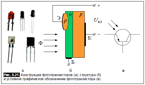 Фототранзистор – это полупроводниковый фотоэлектрический прибор с двумя p–n -переходами. Устройство и принцип действия фототранзистора такие же, как и биполярного транзистора. Отличие же заключается в том, что внешняя часть базы является фоточувствительной поверхностью, а в корпусе имеется окно для пропускания света (рис. 6.21).