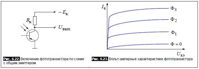 Принцип действия фототранзистора заключается в следующем. В затемнённом состоянии и отсутствии входного сигнала на базе транзистор закрыт и в его коллекторной цепи протекает небольшой обратный ток коллекторного перехода. При освещении базовой области лучами света там происходит возникновение пар «электрон – дырка». Неосновные носители (в нашем случае дырки) подхватываются полем коллекторного перехода и перебрасываются в область коллектора, а в базе остаётся нескомпенсированный заряд электронов – основных носителей – который приводит к снижению потенциального барьера эмиттерного перехода и к инжекции дырок из эмиттера в базу. Это приведёт к увеличению коллекторного тока, как если бы на вход транзистора был бы подан входной сигнал, вызвавший такую же инжекцию носителей. Но здесь вместо входного электрического сигнала был использован световой сигнал. Коллекторный ток Таким образом, чувствительность фототранзистора в Схемы включения его, так же, как и биполярного транзистора, могут быть с общей базой, общим эмиттером, с общим коллектором. В качестве примера на рис. 6.22 приведена схема включения с общим эмиттером. Вольт-амперная характеристика фототранзистора очень напоминает выходные характеристики биполярного транзистора (рис. 6.23), с той лишь разницей, что снимаются они при постоянном световом потоке. Остальные характеристики фототранзистора идентичны характеристикам фотодиода.