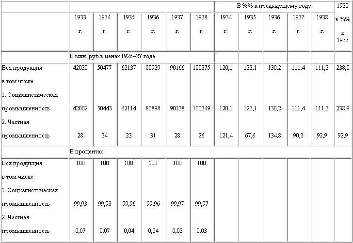 а) Промышленность. Движение нашей промышленности за отчетный период представляет картину неуклонного подъема. Подъем этот отражает не только рост продукции вообще, но прежде всего процветание социалистической промышленности, с одной стороны, гибель частной промышленности, с другой стороны. Вот соответствующая таблица: