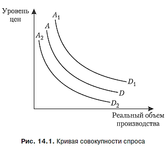Значит, AD находится в прямой зависимости от денежной массы и скорости обращения денег, и в обратной – от совокупной цены. Совокупный спрос, находясь в обратной зависимости от цены, снижается под влиянием ряда факторов. Так, на величину совокупного спроса влияют следующие ценовые факторы: 1. «Эффект процентной ставки». Повышение уровня процентной ставки, т.е. цены использования ссуды. Дело в том, что рост уровня цен заставляет и потребителей, и производителей брать деньги в долг. Это обстоятельство повышает процентную ставку. Поэтому покупатели откладывают свои покупки, а предприниматели сокращают инвестиции. В результате совокупный спрос уменьшается. 2. «Эффект богатства». При повышении цен стоимость таких элементов богатства, как акции, облигации, срочные активы (кассовые остатки), падает и население, владеющее ими, беднеет. В результате совокупный спрос сокращается. 3. «Эффект импортных товаров». При росте цен внутри страны спрос на отечественные товары сокращается, а на более дешевые импортные – растет. Все эти эффекты, связанные с изменением уровня цен, графически изображаются движением по кривой совокупного спроса (AD), приближая ее к оси абсцисс. Неценовые факторы смещают саму кривую АD совокупного спроса либо вправо (A1D1), когда спрос увеличивается, либо влево (A2D2), когда он уменьшается (рис. 14.1).