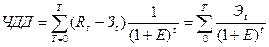 где t - номер шага расчета (t = 0, 1,2,...,!). При принятой норме дисконта Е чистый дисконтированный доход (ЧДД) определяется как сумма эффектов (разниц между результатами и затратами) за весь расчетный период, приведенных к начальному шагу, или как превышение интегральных результатов над интегральными затратами. Если норма дисконта постоянна, величина ЧДД определяется по формуле: