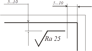 На линии невидимого контура допускается наносить обозначения шероховатости только в случаях, когда от этой линии нанесен размер. Для детали, изображенной с разрывом, обозначение шероховатости дают только на одной части, ближе к размеру. Обозначение шероховатости поверхности, в которой знак не имеет полки, располагают относительно основной надписи чертежа так, как показано на рисунке 6.