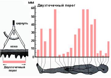 Порогом обонятельной чувствительности считается минимальный объём паров пахучего вещества, который должен пройти через носовые ходы, чтобы вызвать ощущение определённого запаха. Ольфактометр представляет собой герметично закрытый сосуд, на дне которого находится пахучее в-во (например, камфора). Через одну трубку с помощью шприца в сосуд дополнительно вводят несколько миллилитров воздуха; через другую трубку (если открыть зажим) такое же количество воздуха, содержащее молекулы пахучего в-ва, пройдёт через носовые ходы испытуемого. Объём воздуха увеличивают до тех пор, пока испытуемый не почувствует запах. Порог ощущения – минимальная сила раздражителя, действие которого вызывает тактильное ощущение. Порог различения – это минимальное усиление (или ослабление) действующего раздражителя, которое ощущается человеком. Для тактильной чувствительности важной характеристикой является порог пространственного различения. Он определяется как минимальное расстояние между двумя точками кожи (или слизистой оболочки), при одновременном раздражении которых возникает ощущение двух прикосновений (а не одного). Пространственный порог тактильной чувствительности разный для разных участков: