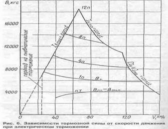 В случае выхода из строя CAP переключатель ПВА устанавливают в положение, соответствующее аварийному возбуждению. При этом контактами ПВА замыкаются накоротко тиристоры Т1 и Т2 блока БВГ, а в цепь возбуждения возбудителя В вводится резистор Рва. При переводе контроллера машиниста с нулевой на более высокие позиции участки резистора Рва шунтируются контактами контакторов КВА1 (на 7 — 15-й позициях) и КВА2 (на 12 — 15-й позициях), что приводит к увеличению тока возбуждения возбудителя и, следовательно, тока возбуждения тягового генератора. В аварийном режиме ток возбуждения генератора выпрямляется неуправляемым мостом Д1 —Д4 блока БВГ, а величина его на каждой позиции контроллера машиниста остается неизменной. Благодаря большому падению напряжения на индуктивном сопротивлении обмоток и реакции якоря внешние характеристики генератора имеют резко падающий характер (рис. 5). Поэтому не требуется принимать специальных мер для ограничения максимального тока тягового генератора. СИСТЕМА АВТОМАТИЧЕСКОГО РЕГУЛИРОВАНИЯ ЭЛЕКТРИЧЕСКОГО ТОРМОЗА (САРТ) Система автоматического регулирования электрического тормоза (САРТ) обеспечивает получение требуемых тормозных характеристик тепловоза (рис. 6). Возможности электрического тормоза ограничены допустимыми режимами работы тяговых двигателей, поэтому предельная тормозная характеристика состоит из отдельных участков ограничений: по максимальному току возбуждения Ig maxi максимальному току якоря 1д тах и ограничения тока якоря по коммутационной способности электродвигателей, которое характеризуется максимально допустимой величиной произведения тока якоря на скорость движения (IqV)max. При работе на участке характеристики Iq max = const реализуется максимальная мощность тормоза, а на других участках она уменьшается. Чтобы машинист имел возможность изменять тормозное усилие и устанавливать его в соответствии с реальными условиями движения, предусмотрены частичные характеристики с ограничением по величине тормозного усилия Вщ. Для сжатия состава перед включением полного тормозного усилия введена ступень предварительного торможения с минимальным тормозным усилием Впт = Втщ, которая включается на 6 с. Кроме перечисленных, САРТ обеспечивает получение характеристики V = const. т.е. поддержание при движении на спусках заданной машинистом скорости движения путем автоматического регулирования тормозного усилия. Регулирование тормозной силы осуществляется от Bmin до значения Вш, установленного машинистом. Минимальная тормозная сила Втщ необходима для поддержания сцепных устройств поезда в сжатом состоянии и предотвращения нежелательных продольных реакций. При срабатывании защиты от юза САРТ уменьшает тормозную силу до некоторого значения В|оз, при котором восстанавливается сцепление колес с рельсами, и юз прекращается. Элементы системы автоматического регулирования САРТ расположены в блоке электрического тормоза БЭТ. Учитывая, что они требуют различные напряжения питания, в БЭТ предусмотрен свой блок питания, подключаемый к источнику постоянного напряжения 110 В при включении контакторов КТ или КВВ. На тепловозах ТЭП70 с № 208 вместо блока КУА-14 внедрен новый блок электрического тормоза типа КУА-14Б, в котором элементы усиления и сравнения сигналов выполнены на микросхемах. Основными органа