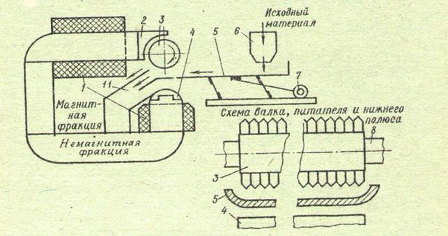 1 – электромагнитная система; 2,4 – полюсные наконечники; 3 – валок; 5 – вибрационный питатель; 6 – бункер; 7 – привод; 11 – делительная перегородка
