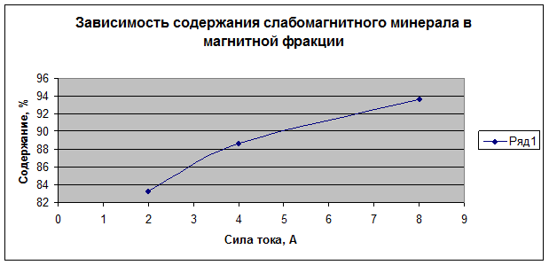 Вывод: Ознакомились с процессом магнитного обогащения, конструкцией магнитного сепаратора с сильным магнитным полем, данные занесены с таблицу, построены графики зависимости, которые показывают, что, чем выше сила тока, тем выше и показатели извлечения и содержания слабомагнитного минерала в продукте.