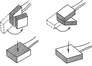 Современная художественная ковка включает в себя весь арсенал приемов ручной ковки, известный кузнецам прошлых столетий. Основные техники ковки практически не изменились; число их осталось прежним. Как и в былые времена, талантливые кузнецы нашего времени, используя ограниченный набор традиционных техник, создают огромное многообразие художественных изделий. Во время технологической обработки (ковки) металла происходит скольжение зерен относительно друг друга, в результате чего они вытягиваются в направлении течения металла (рте. 40). Вытягиваются и неметаллические вкрапления, которые придают металлу волокнистое строение. Величина зерен к концу деформации металла зависит от его температуры к концу ковки: чем она выше, тем крупнее зерна и тем лучше механические свойства металла. Куют большинство металлов в нагретом состоянии, так как под воздействием высоких температур металл становится более пластичным и податливым. В предыдущем разделе были подробно рассмотрены термические условия ковки, указаны начальная и конечная температура ковки стали. В процессе ковки металл постепенно остывает, что сказывается на его пластичности. Малоуглеродистые стали можно обрабатывать достаточно продолжительное время без дополнительного нагрева в кузнечном горне. А высокоуглеродистая сталь куется трудно, требует умелого обращения с нагретым металлом и грамотного проведения его нагревания. Технологическая обработка металла включает в себя несколько основных операций и множество приемов, разработанных на их основе. Выбор того или иного приема зависит от свойств конкретного металла, размеров и формы заготовки, наличия инструментов, а также определяется художественными замыслами кузнеца. Основные операции ковки: — вытяжка, — осадка, — рубка, — выбивание отверстий, — гибка, — торсирование В работе с листовым металлом используются выколотка, дмфовка, формовка, а также такие виды декоративной отделки поверхности как чеканкаипросечка. Прежде чем приступать к ковке изделия, необходимо составить точный конструктивный чертеж с учетом припусков на слесарную обработку (если она необходима). Наличие чертежа позволит достаточно точно определить: — массу требуемого материала (а это может быть не только металл), включая отход металла на обсечку (до 20-30 %) и на угар (2-3 % на каждый нагрев и 1,5-2 % на каждый подогрев); — наиболее приемлемые операции ковки; — способы соединения отдельных частей изделия; — набор инструментов, необходимых для воплощения изделия в металле. Еще на этапе создания эскиза, предшествующем составлению конструктивного чертежа, следует учитывать технологические особенности ковки и избегать нехарактерных для нее форм и конфигураций. В частности, начинающему кузнецу, неискушенному в ковке, следует избегать деталей с ребристым сечением, деталей с резкими перепадами в размерах и пересечения цилиндрических деталей. Назначение операции — увеличение длины заготовки за счет уменьшения площади ее поперечного сечения. Иными словами, вытяжку (протяжку) (рис. 41, цв„ вставка 14) применяют в тех случаях, когда необходимо вытянуть металлическую заготовку в длину. Часто к вытяжке прибегают с целью устранения внешнего дефекта на поверхности заготовки или чтобы улучшить зернистую структуру металла. Вытяжку производят на наковальне