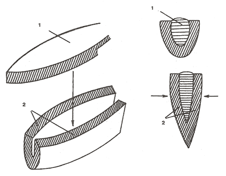 Обеспечение надежности длинного меча: 1 -сердечник из мягкого металла; 2-оболочка из твердого металла