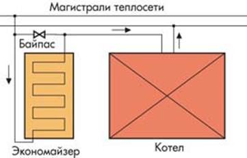 При переводе котельной на водогрейный режим, как указывалось, тепловая схема котельной упрощается, в частности, за счет исключения пароводяных подогревателей: вода из теплосети обычно подается непосредственно в котлы. В этом случае необходимо отдельно рассмотреть работу существующих экономайзеров. Водяной экономайзер можно включить в теплосеть параллельно котлу (рис. 2а) или последовательно с котлом (рис. 2б). Параллельное включение несколько сложнее в эксплуатации — экономайзеры необходимо включать и выключать по воде отдельно от котла. Поэтому, как правило, используют схему 2б. По любой схеме при наладке следует отрегулировать степень открытия байпаса так, чтобы температура воды на выходе из экономайзера не была слишком высокой (обычно не более 90°С), иначе возможны гидроудары в экономайзере. Вообще, при переходе на теплоноситель с более низкой температурой (температура пароводяной смеси в паровом котле 160–180°С, средняя температура воды в водогрейном котле — от 70 до 110°С) экономичность котла повышается и соответственно уменьшается потребность в дополнительной утилизации тепла. Поэтому следует рассматривать необходимость внутренней переделки экономайзера. Чугунные экономайзеры для подогрева питательной воды паровых котлов представляют собой несколько горизонтальных рядов оребренных труб, причем для подогрева питательной воды паровых котлов трубы в горизонтальных рядах включены по воде последовательно (см. рис. 2б). Чтобы обеспечить более эффективный подогрев сетевой воды, в теплофикационных экономайзерах все трубы горизонтальных рядов включают параллельно (см. рис. 2а). При переводе котлов на водогрейный режим для работы в температурном графике 150–70°С с расчетными нагрузками по теплу обычно предусматривают переделку существующих питательных экономайзеров на теплофикационную схему с параллельным движением воды в трубах (см. рис. 2а). Это требует установки дополнительных коллекторов и переключения калачей, соединяющих между собой оребренные трубы. Поскольку температура продуктов сгорания на выходе из котлов, предназначенных для работы в водогрейном режиме с частичной загрузкой или с пониженным температурным графиком, достаточно низка, необходимости в переборке экономайзера нет. Для котлов, работающих с реальной температурой подогрева воды до 80–90°С и с частичной нагрузкой, температура продуктов сгорания на выходе из котла редко превышает 140–170°С. Учитывая, что падение температуры продуктов сгорания ниже этих значений ухудшает рассеивание факела выбросов и надежность работы дымовых труб, в случае эксплуатации котлов с неполной нагрузкой и низкой температурой подогрева воды следует рассматривать целесообразность полного отключения водяных экономайзеров по воде и продуктам сгорания.