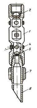 Аппарат для пескоструйной перфорации АП-6М: 1 - корпус. 2 - шар опрессовочного клапана; 3 - узел насадки; 4 - заглушка; 5 - шар клапана; 6 - хвостовик; 7 – центратор