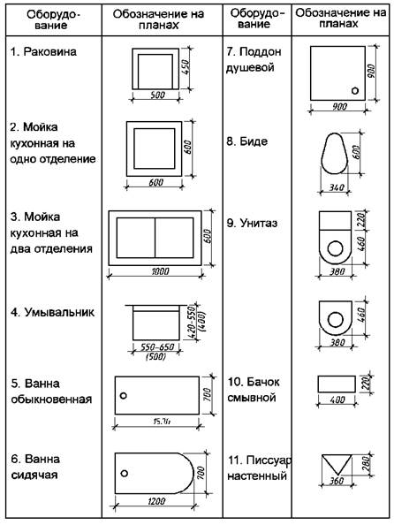 5 Условные обозначения санитарно – технического оборудования (ванны, унитазы, раковины и т.д.), а также дымовые и вентиляционные каналы (рис.11в) При вычерчивании чертежей планов зданий графическое обозначение санитарно-технического оборудования следует вычерчивать в масштабе, принятом для данного плана. Все указанные элементы вычерчивают тонкими сплошными линиями. Размеры санитарно–технического оборудования по ГОСТ 21.205-93 даны в таблице 7. Условные обозначения вентиляционных и дымовых каналов даны в таблице 5.