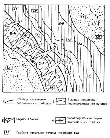 Инженерно-геологической картой называется графическое изображение важнейших инженерно-геологических факторов в пределах изучаемой территории, подлежащих учету при проектировании, строительстве, эксплуатации сооружений и осуществлении других инженерных мероприятий. По данным инженерно-геологической съемки, в процессе которой изучаются геологические, геоморфологические и гидрогеологические условия, составляются инженерно-геологические карты и разрезы. Составляются три типа инженерно-геологических карт: карты инженерно-геологических условий, карты инженерно-геологического районирования и инженерно-геологические карты специального назначения. Карту инженерно-геологических условий составляют для всех видов наземного строительства, ее используют для общей оценки природных условий, в которых проектируется строительство. Эти карты могут быть частными, отражающими закономерности изменения отдельных инженерно-геологических факторов (трещиноватости, просадочности и др.) и общими, характеризующими все естественные факторы инженерно-геологических условий территории, но не дающими их суммарной оценки (рис.6). Карту инженерно-геологического районирования составляют как для общих, так и специальных целей на основе общности инженерно-геологических условий отдельных частей территории с выделением на ней таксономических подразделений – регионов, областей, районов и т.д., – число возрастает по мере увеличения масштаба; при детализации можно выделять районы, участки и т.д. (рис.7). Специальные инженерно-геологические карты составляют применительно к требованиям конкретного объекта строительства или несколько однородных его видов. На них дается оценка инженерно-геологических условий территории и прогноз инженерно-геологических явлений. Для районов сос сложным геологическим строением рекомендуется составлять вспомогательные карты, характеризующие отдельные элементы инженерно-геологических условий, например: оползневые, карстовые, геоморфологические, гидрогеологические, карты-срезы на определенной отметке, карты мощностей пород и т.д. Каждая инженерно-геологическая карта состоит из собственно карты, условных обозначений, инженерно-геологических разрезов и пояснительной записки. Кроме этого составляется сводная инженерно-геологическая колонка с инженерно-геологическими характеристиками горных пород. В приложении к тексту пояснительной записки дается каталог опорных выработок, показанных на карте.