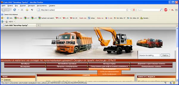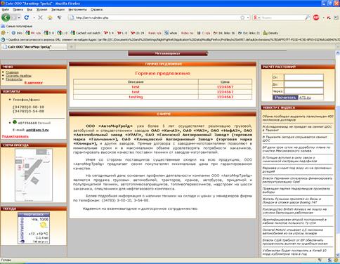 Интерфейс – это вид рабочего окна программного продукта, представляющий собой совокупность элементов, позволяющих пользователю программы управлять ее работой и получать требуемые результаты. Необходимо, чтобы сайт был как можно проще в использовании и понятнее. Поскольку web-сайт предназначен для публикации в Сети и для предоставления информации его посетителям, информация должна быть как можно более удобно организована логически и визуально. Логическая организация важна для быстрого поиска необходимой и интересующей информации, а визуальное оформление важно для нормального восприятия представленной информации. С точки зрения как эстетики, так и целостности восприятия, дизайн всех страниц сайта должен быть выдержан в одном стиле. С точки зрения реализации сайта в целом, можно выделить три стиля дизайна: - текстовый, где все элементы управления и структурирования (заголовки, рубрики и прочее) представляют собой просто текстовые фрагменты, заключённые в соответствующие теги; - графический, в котором управляющие и структурирующие элементы реализованы с помощью графических файлов; - технологический, в котором для управления и структурирования используются объекты JavaScript, вставки Shockwave и т.д.. Если говорить о web-дизайне с точки зрения отдельной страницы, то можно выделить следующую классификацию: - академический дизайн, основанный на использовании исключительно тегов HTML 2.0 или почти совпадающих с ним тегов HTML 4.0; для него характерно отсутствие любых средств позиционирования текста и графики; - «резиновый» табличный дизайн, где для позиционирования текста и графики используются таблицы, размер которых задан в процентах от ширины окна; - «жёсткий» табличный дизайн, когда для позиционирования элементов страницы используются таблицы с размером, жёстко заданным в пикселах; - технологический дизайн, когда всё управление элементами страницы осуществляется посредством технологии типа Java или Macromedia Flash. Дизайн web-сайта фирмы ООО «АвтомирТрейд» выполнен в технологическом стиле с использованием скриптов, также использованы гипертекстовые ссылки и flash элементы. Каждая страница загружается с шаблона, что даёт идентичность страниц в дизайне. Верстка была сделана в табличном стиле, поэтому сайт оптимизирован под разнообразные разрешения экрана пользователей. Вверх сайта – шапка в виде нескольких изображений объединенных в одно изображение. В шапку входит и блок поиска, с помощью которого происходит поиск требуемой информации по каталогу, которую можно увидеть на рисунке 3.3.