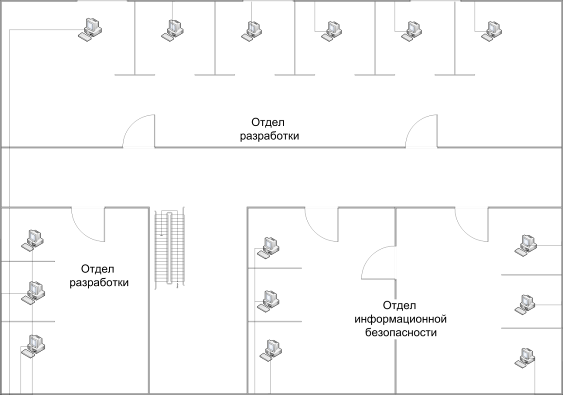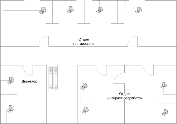 Недостатки: · выход из строя центрального концентратора обернётся неработоспособностью сети (или сегмента сети) в целом; · для прокладки сети зачастую требуется больше кабеля, чем для большинства других топологий; · конечное число рабочих станций в сети (или сегменте сети) ограничено количеством портов в центральном концентраторе. РАЗДЕЛ 3. ВЫБОР РАЗМЕРА И СТРУКТУРЫ СЕТИ Каждая фирма формулирует собственные требования конфигурации сети, определяемые характером решаемых задач. В первую очередь необходимо установить, сколько человек будет работать в сети. Количество рабочих станций напрямую зависит от предполагаемого числа сотрудников. Фирме, построенной по принципу вертикальной структуры точно известно какой сотрудник и к какой информации должен иметь доступ, поэтому в данной сети будем использовать сеть с выделенным сервером. Только в такой сети существует возможность администрирования прав доступа к определенным ресурсам сразу для группы пользователей. В офисном здании имеется 50 рабочих станций, которые требуется объединить в локальную сеть. При этом они должны быть объединены в следующие группы: 1. Директор предприятия – 2 рабочих станции; 2. Отдел информационной и технической поддержки – 2 рабочих станции; 3. Отдел разработки – 20 рабочих станций; 4. Отдел тестирования – 7 рабочих станций; 5. Финансовый отдел – 6 рабочих станции; 6. Отдел оформления заказов – 3 рабочих станции; 7. Отдел информационной безопасности – 6 рабочих станций; 8. Отдел web-дизайна – 4 рабочих станции.