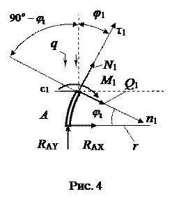 2. Определение внутренних усилий в поперечных сечениях арки. Характерных участков изменения внешней нагрузки на арке 2: первый - от левой опоры А до сечения, в котором приложена сила Р и второй – от силы Р до опоры В. Необходимо получить выражения для продольной силы N,попе-речной силы Q и изгибающего момента М на каждом участке. Напомним правила их направления: положительная N направлена от сечения вдоль касательной τ, положительная Q направлена вдоль нармали n, но так, чтобы поворачивала мысленно отсеченный участок арки по ходу часовой стрелки, М - чтобы увеличивала кривизну арки. Мысленно отсекать на арке нужно участки с острыми центральными углами, поскольку внутренние силовые факторы в арке будут определяться через тригонометрические функции указанного централь-ного угла. Рассмотрим определение N 1, Q 1, M 1 на 1-м участке арки. Расчетная схема представлена на рис. 4. Положение сделанного мысленного рассечения арки I-I определяется произвольным острым углом φ 1 (0 ≤ φ 1 ≤ φ 0).
