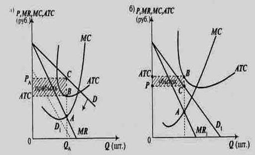 Рис. 7.1. Равновесие в краткосрочном периоде в условиях монополистической конкуренции: а) прибыль фирмы; б) убыток фирмы