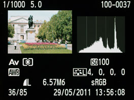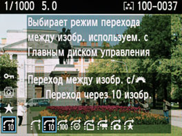 Соотношение сторон монитора у Canon EOS 1100D составляет 4:3, а формат кадра, как и у всех зеркальных камер Canon, соответствует «пленочному» соотношению 3:2. Поэтому кадр занимает не всю площадь экрана, остается свободной узкая полоса, в которой отображается краткая, но самая важная, информация о его параметрах.