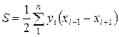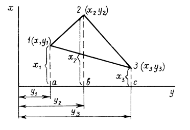 В первом случае участок разбивают преимущественно на треугольники, реже на прямоугольники и трапеции (рис. 12). Измеряют линейные элементы (стороны, высоты) и по формулам геометрии вычисляют площади каждой фигуры. Для контроля площади вычисляют дважды, меняя измеряемые элементы. Например, в треугольнике 1–2–3 в одном случае измеряют основание 1–2 и высоту 3–5, в другом – основание 1–3 и высоту 2–4. Расхождение между двумя значениями площадей не должно превосходить Вычисление площади аналитическим способом, по координатам вершин углов многоугольника, обеспечивает более высокую точность (до Расчетная формула для определения площади многоугольника (в простейшем случае треугольника – рис. 13):