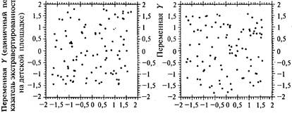 Рис. 4.1. Корреляционные поля, показывающие корреляцию, равную0,16 (а), и корреляцию, равную 0,00 (б). носящихся к одной и той же черте личности, такой, как, например,экстраверсия. Эта корреляция равняется в нашем случае 0,16. Данное корреляционное поле может изображать, например,взаимосвязь между показателями общительности учеников шесто-го класса некоей начальной школы, зафиксированными в один издней во время обеда, и показателями общительности, зафиксиро-ванными несколькими днями позже на игровой площадке. Мывидим большую вариативность уровней экстравертированности,проявленной различными детьми в каждой из ситуаций, и слабуювзаимосвязь между реакциями этих детей в первой и во второйситуациях, с трудом отличимую, по крайней мере, при бегломпросмотре от полного ее отсутствия (см. рис. 4.1,6). Столь незначительная взаимосвязь, очевидно, означает, чтознание о реакции, проявленной индивидом в одной из ситуаций,мало чем может нам помочь в предсказании реакции в другой по-добной ситуации. Чтобы быть более точными, основываясь на тра-диционной формуле регрессии, можно сказать, что наилучшее приДанных обстоятельствах предсказание сократило бы нашу среднюю,или «стандартную» ошибку прогнозирования на очень незначи-тельную величину (всего около 1%). Причина лежит на поверхности. Когда предсказываемые ре-эультаты, как в случае с показателями экстраверсии наших шес- 13*
