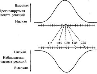 Рис. 4.2. Наиболее удачные предсказания последующей реакции (верх-ний график распределения), основанные на знании предшествующейреакции (нижний график распределения) для индивидов, показателикоторых равны пяти различным процентным рангам (С). тиклассников, чрезвычайно вариабельны, наилучший прогноз, ко-торый мы могли бы дать, основываясь на нашем знании об однойиз предыдущих реакций, будет фактически во всех случаях соот-ветствовать среднему для наших шестиклассников уровню экстра-вертированности. Иными словами, сделанные нами предсказаниябудут в целом похожи на те, что мы сделали бы, не зная ничего об экстравертированных проявлениях того или иного индивида впрошлом. Графически эта мысль отображена на рис. 4.2. Нижнее из двухраспределений отражает наблюдения за поведением в отдельновзятом случае, к примеру уровень агрессивности, которую про-явили 100 шестиклассников на детской площадке во вторник. Рас-пределение представляет собой знакомую кривую в форме коло-кола, на которой частота вероятности отдельной реакции умень-шается, по мере того как рассматриваемая реакция становится всеболее экстремальной. Выберем для рассмотрения пятерых детей: ребенка, проявляю-щего уровень агрессивности на два стандартных отклонения Hffiсредней величины (процентный ранг «2» означает, что меньшую агрессивность проявил только один ребенок из совокупности); ребенка, уровень агрессивности которого ниже средней на вели-чину одного стандартного отклонения (процентный ранг «15» оз-начает, что данный ребенок попадает приблизительно в нижнююшестую или седьмую части распределения уровней агрессивнос-ти); ребенка, проявившего средний уровень агрессивности (про-центный ранг «50»), и двух детей с уровнем агрессивности вышесреднего на величину соответственно одного (процентный ранг«85») и двух (процентный ранг «98») стандартных отклонений*.Верхний график распределения иллюстрирует наше самое удачноепредсказание степени агрессивности, которую в соответствии снашими ожиданиями те же самые шестиклассники, включая пя-терых отобранных для особого рассмотрения, должны были про-явить во время экскурсии в музее естественной истории. Легко увидеть, что наиболее точный прогноз, который мы моглибы дать по каждому из детей, соответствует уровню агрессивнос-ти, близкому к среднему. Их действительные реакции будут, ко-нечно же, весьма вариативны, но, принимая во внимание то, чтокоэффициент корреляции равняется всего 0,16, мы не сможемпредсказать, кто из этих детей проявит экстремальную реакцию,а кто нет. Так что даже в случае с одним из двух детей, проявившихнаибольшую агрессивность на детской площадке (предположим,это был Билли, который повалил Эллен и Джеймса наземь и крик-нул: «Отвали!» — застенчивому Чарли), лучший прогноз будет зак-лючаться в том, что Билли будет лишь немного агрессивнее «сред-него» ребенка, возможно, он будет чуть более активно толкатьсялоктями, стоя в строю и достаточно громко ворчать по поводускучной экспозиции, привлекая внимание кого-либо из учителей.И действительно, находясь в музее, он с гораздо меньшей вероят-ностью совершит что-либо в самом деле агрессивное (например,затеет драку), чем будет вести себя более спокойно по сравнениюоо средним одноклассником. Наоборот, и это не менее существен-но, Джейн, которая сорвала с вешалки пал
