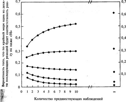 Рис. 4.4. Вероятность того, что испытуемый получит в пределах вы-борки процентный ранг не ниже «98» (согласно свойствам по крайнеймере одной из десяти последующих реакций и, исходя из его предшеству-ющего ранга, основанного на различном числе наблюдений). лями нескольких проявлений экстремального поведения, исходя-щего от соответствующих людей, в зависимости от числа предше-ствующих наблюдений (см. рис. 4.4) Мы обнаружим, например,что если экстраверт Гарри и интроверт Том приобрели свою репу-тацию (вместе со своими процентными рангами соответственно«98» и «2») на основании единичного наблюдения, вероятностьтого, что в ходе следующих десяти наблюдений они будут вестисебя так, что это позволит им хотя бы один раз быть отнесеннымик верхним 2% выборки, составит 34% для Гарри и только 8% дляТома. Если же их репутация была заработана в результате десяти"Редыдущих наблюдений, то вероятность подобного события дляГарри возрастет до 52% и упадет до 2% для Тома. Если же они"риобрели свои репутации (соответственно экстраверта и интро-вбрта) в ходе очень большого или даже бесконечно большого чис-