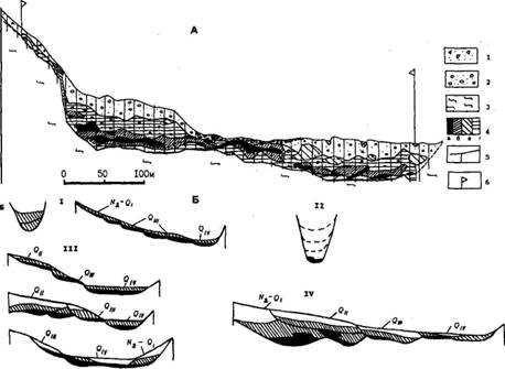 Рис.15. Геологический разрез россыпи платиновых металлов р.Кондер, лин. 204 (по материалам Аяно-Майской ГРЭ) (А) и схематизированные разрезы, отражающие морфогенетическую зональность россыпного месторождения (по Т.С.Хорошиловой [1990]) (Б) Зоны: I – внутренняя «котловина», II – каньон при пересечении кольцевого хребта Кондер, III – за пределами хр.Кондер; IV – междуречье рек Кондер и Уоргалан. Рис. А. 1 – пролювиально-солифлюкционные отложения; 2 – аллювиальные валунно-песчано-галечные отложения; 3 – ультраосновные породы кондерского комплекса; 4 – россыпь: а – с «ураганными», б – с высокими, в – средними, низкими содержаниями платиновых металлов; 5 – горные выработки; 6 – граница россыпи. На рис. Б. сплошной заливкой и штриховкой показаны соответственно высокие и средние содержания платиновых металлов